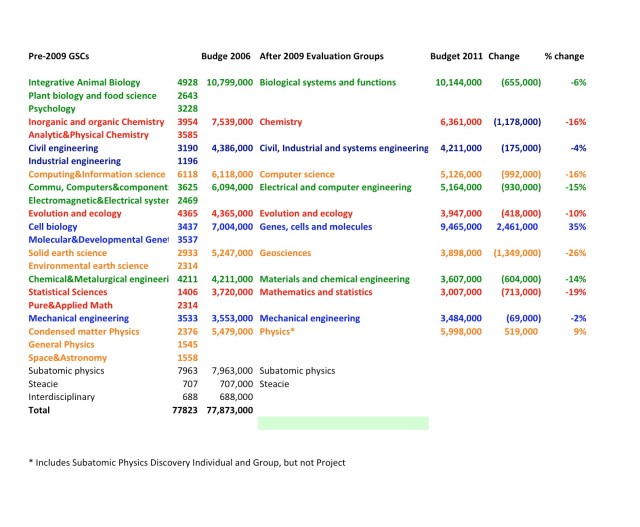 So how could one compare the 2006 budget of a given discipline to its 2011 budget?  Well, we did the most “linear” thing, by first trying to guess which of the old GSCs combined to form a modern EG, then by adding the 2006 budgets of these GSCs and finally by comparing this sum to the 2011 budget of that EG.