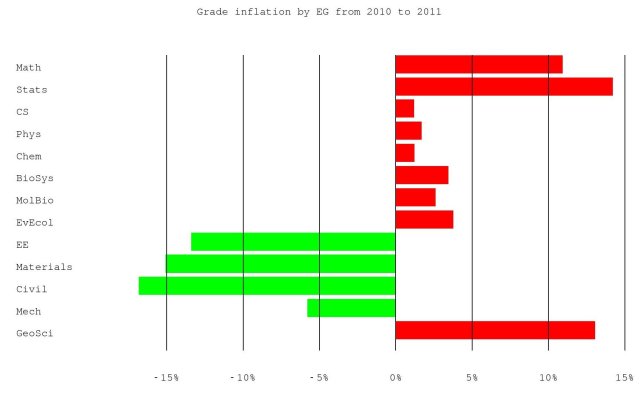 This indicates considerable grade-instability across evaluation groups (over 40 % of the groups experienced grade inflation or deflation of over 10% between 2010 and 2011) with substantial grade inflation in 2011 in geosciences and both of the mathematics and statistics halves of EG1508 and substantial grade deflation in several of the engineering evaluation groups.