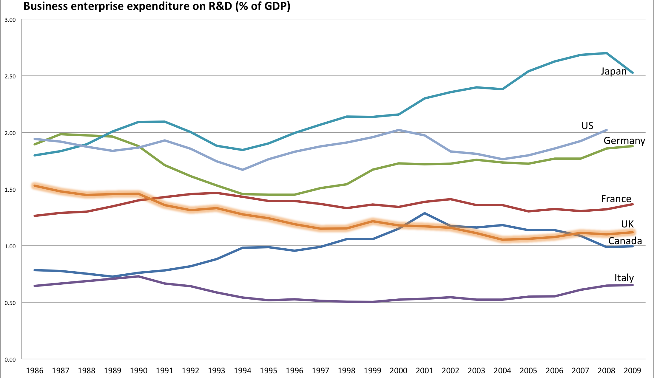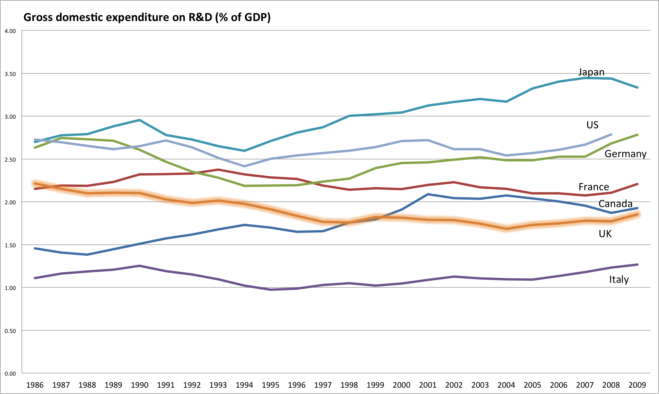 The first table describes the evolution of the GERD from 1986 till 2009. The UK record is so lousy that it allows Canada to brag about moving from sixth to fifth place, even though our numbers had also declined since 2004.