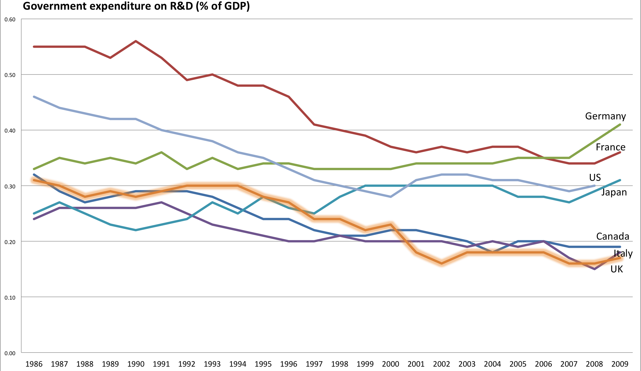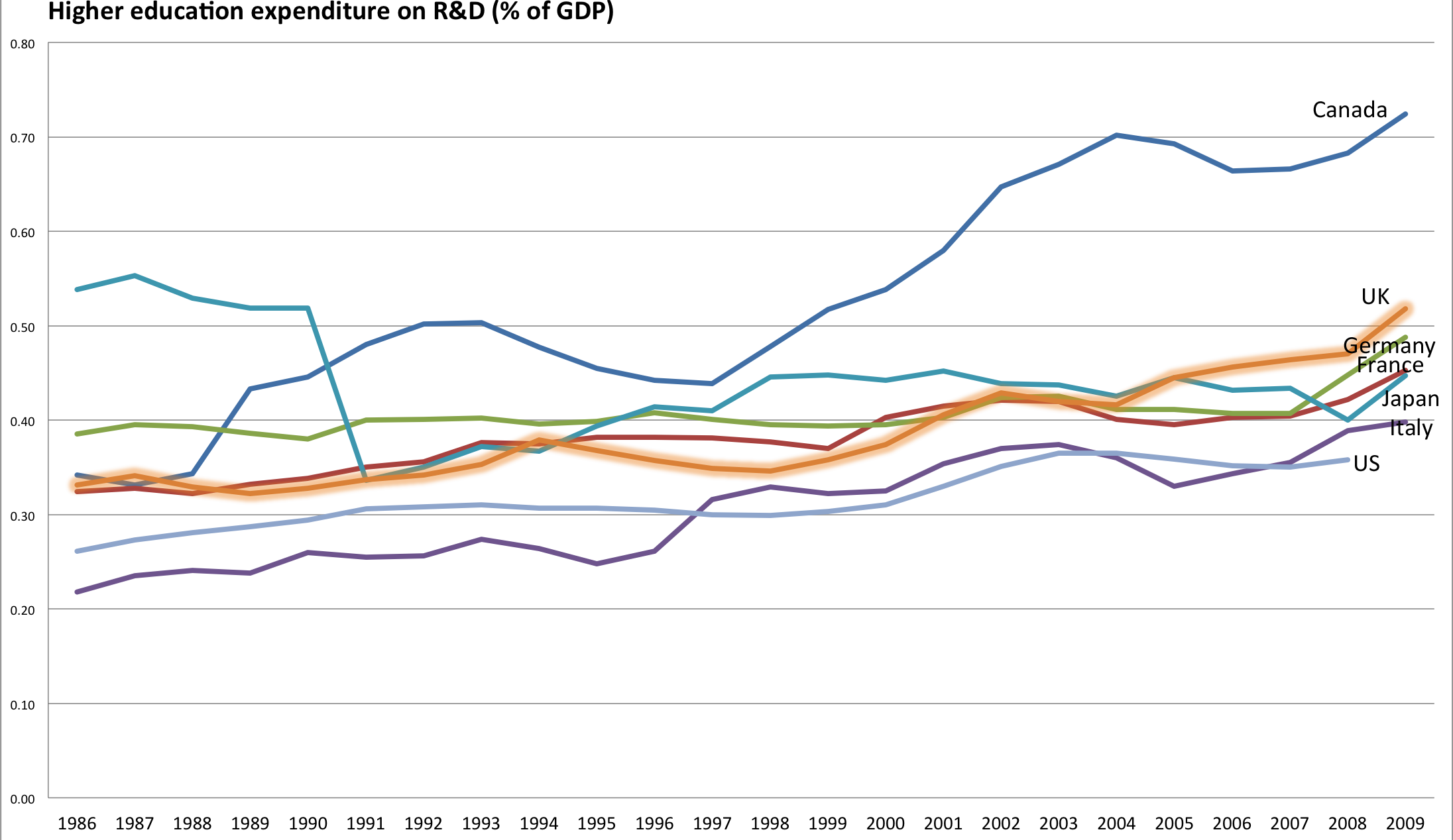 Here the numbers for Canada are astonishing. Besides the federal funding though the Tri-Council and CFI, the numbers seem to include all provincial and federal funding for post-secondary education (with faculty salaries and all). I am told that these figures are not well accepted by the AUCC and university administrations. One also wonders, whether the $2-billion of the Knowledge Infrastructure Program is what accounts for the sharp increase in the post-recession period. This is also questionable accounting.