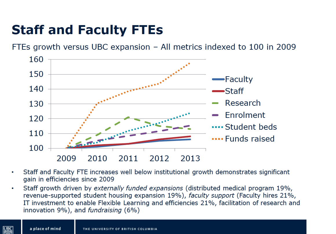 Another calculation shows how the recruitment of excellent faculty could also be a money-generating scheme. Based on 2012 data from a much lower ranked university (alas I don’t have UBC’s) the average amount of external funding per individual researcher in biology, chemistry, and physics is $219,000. The university gets almost 20% in indirect costs on Tri-council grants that new outstanding researchers could bring, notwithstanding the importance of these grants for supporting graduate students, technicians, postdoctoral fellows and lab infrastructure. I say that this is a pretty good potential return on investment in excellence, though I still remember when the Board was told that “the cost of research is a drain on university resources.”