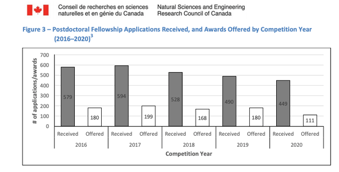 But what do we know about the 2021 results? An applicant in Computer science ranked 6th out of 47, posted on an online chat room that they were on a waitlist. Assuming that all subcommittees are treated similarly, and unless NSERC restores the budget for fellowships, this means this year’s success rate is hovering around 11%. This would be consistent with a -nothing less than cruel- decision by NSERC’s leadership to stick with the cuts implemented in 2020 for the available opportunities while watching the applications multiply. In comparison, the 2021 success rate for the notoriously competitive Banting fellowships which pay $25,000 more than an NSERC postdoctoral fellowship, clocked in at 9.3%.