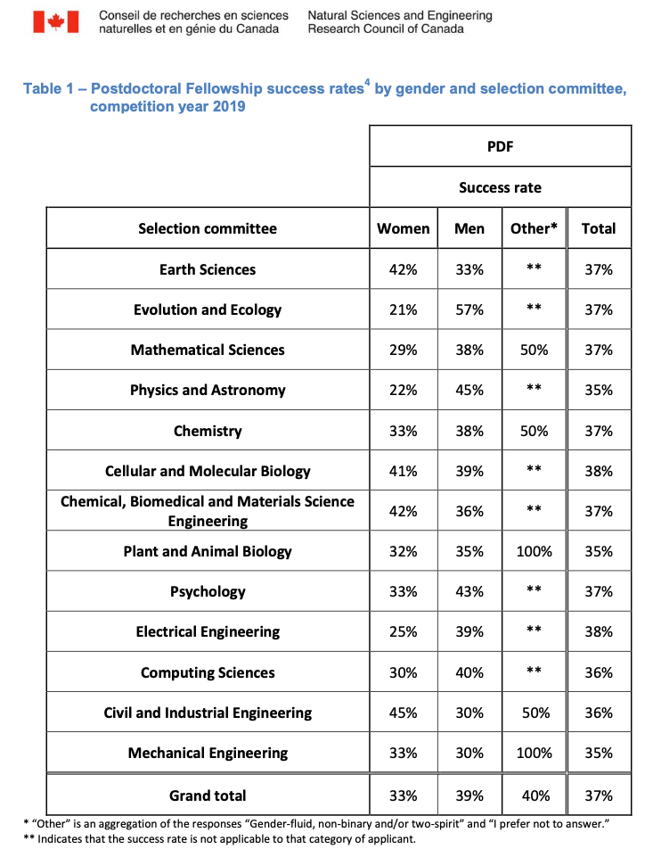 Diversity, diversity, diversity: And as usual, early career women scientists are the most touched by these regressive decisions. One wonders why the NSERC PR machine have been on overdrive lately singing loudly their commitments to equity, diversity and inclusion (EDI). Op-eds in the Ottawa MSM, Celebratory Posters, Glossy reports, yet their own data tell a different story. While CIHR has recently announced the implementation of parity in success rates for men and women, NSERC hasn’t done so. Their numbers show that the success rate for women in 2019 (resp., 2020) was 6% (resp., 3%) below those for men, with even bigger discrepancies in certain disciplines. Canadian women in research are calling for an end to systemic discrimination. NSERC needs to listen.