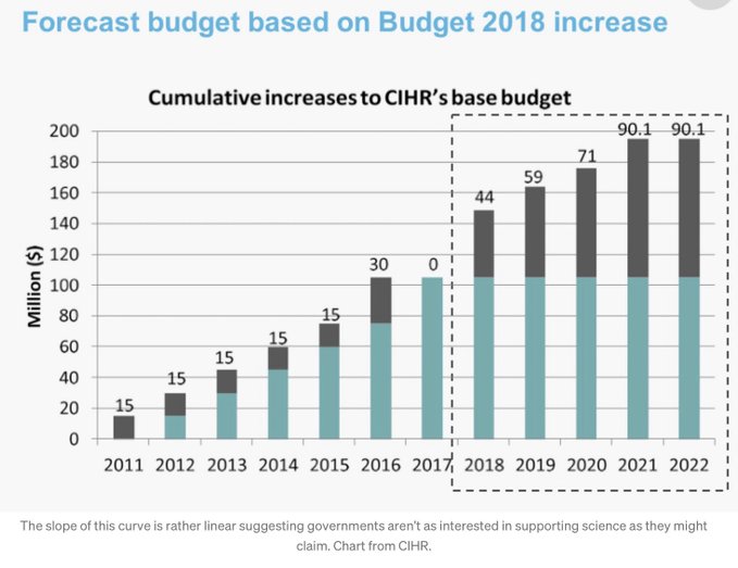 The slope of this curve is rather linear suggesting governments aren’t as interested in supporting science as they might claim. Chart from CIHR.